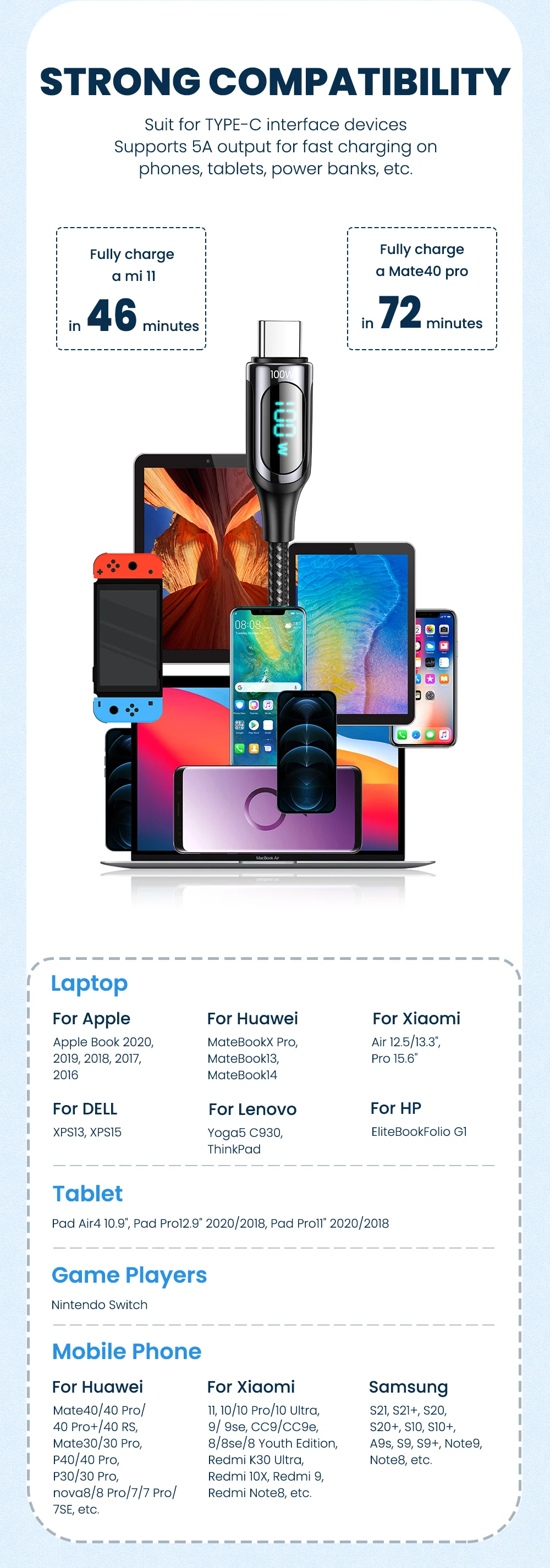 Cable USB C PD 100W para ordenador portátil, tableta, jugadores de juegos, teléfono inteligente