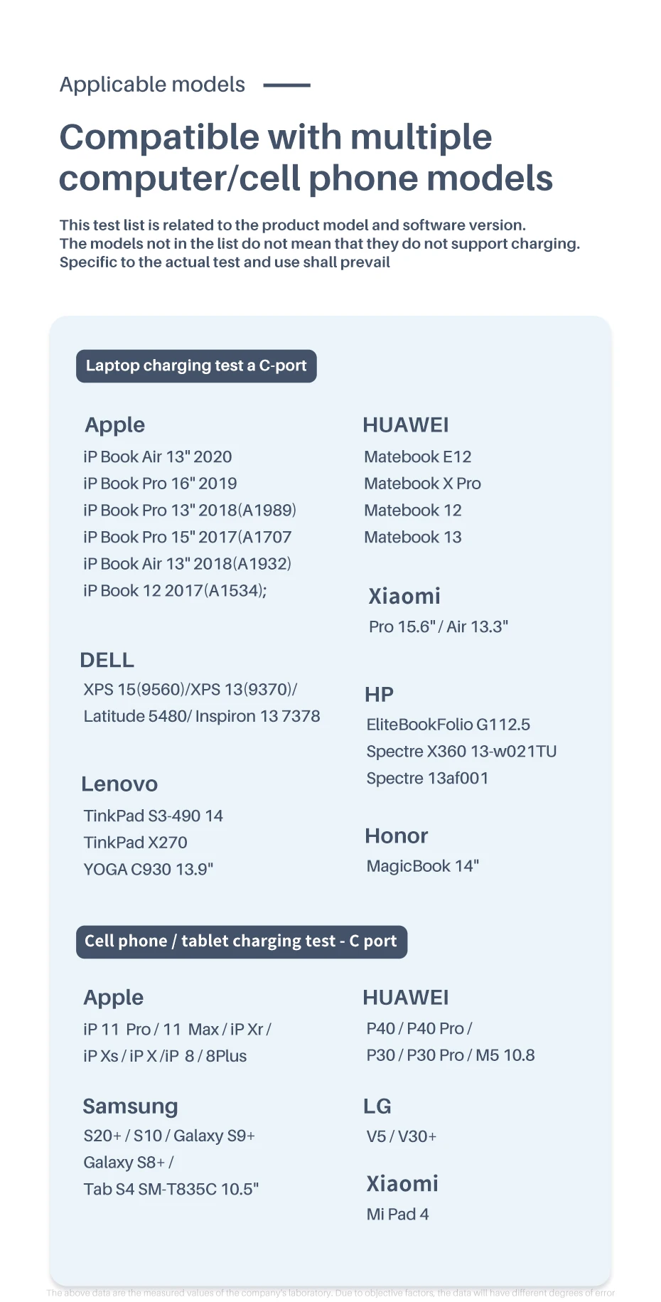 Modelos aplicables-Compatible con múltiples modelos de ordenador/teléfono móvil esta lista de pruebas está relacionada con el modelo del producto y la versión del software. Los modelos que no están en la lista no significan que no admitan la carga específica de la prueba real y prevalecerán el uso…