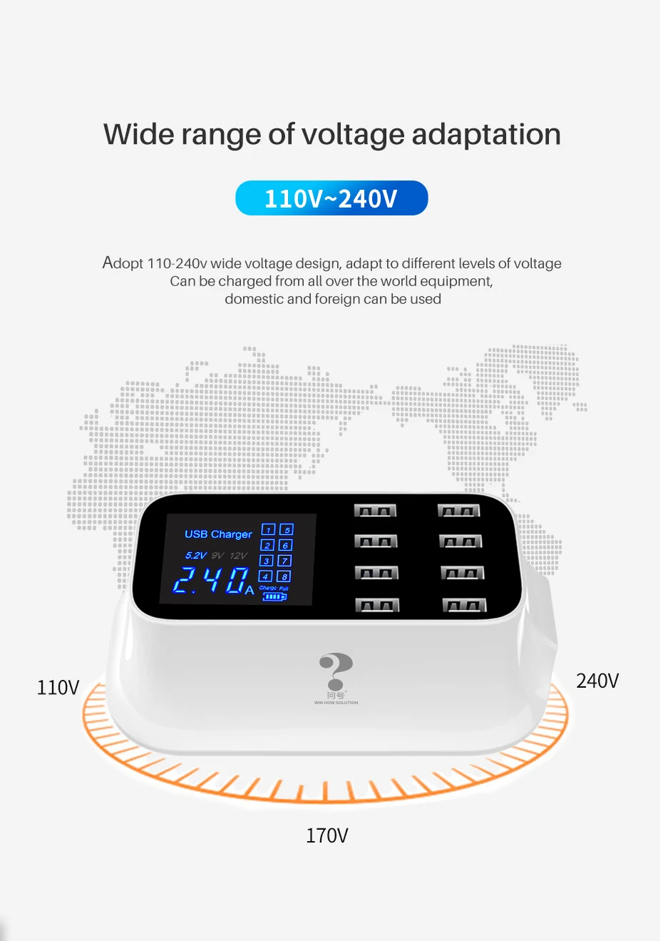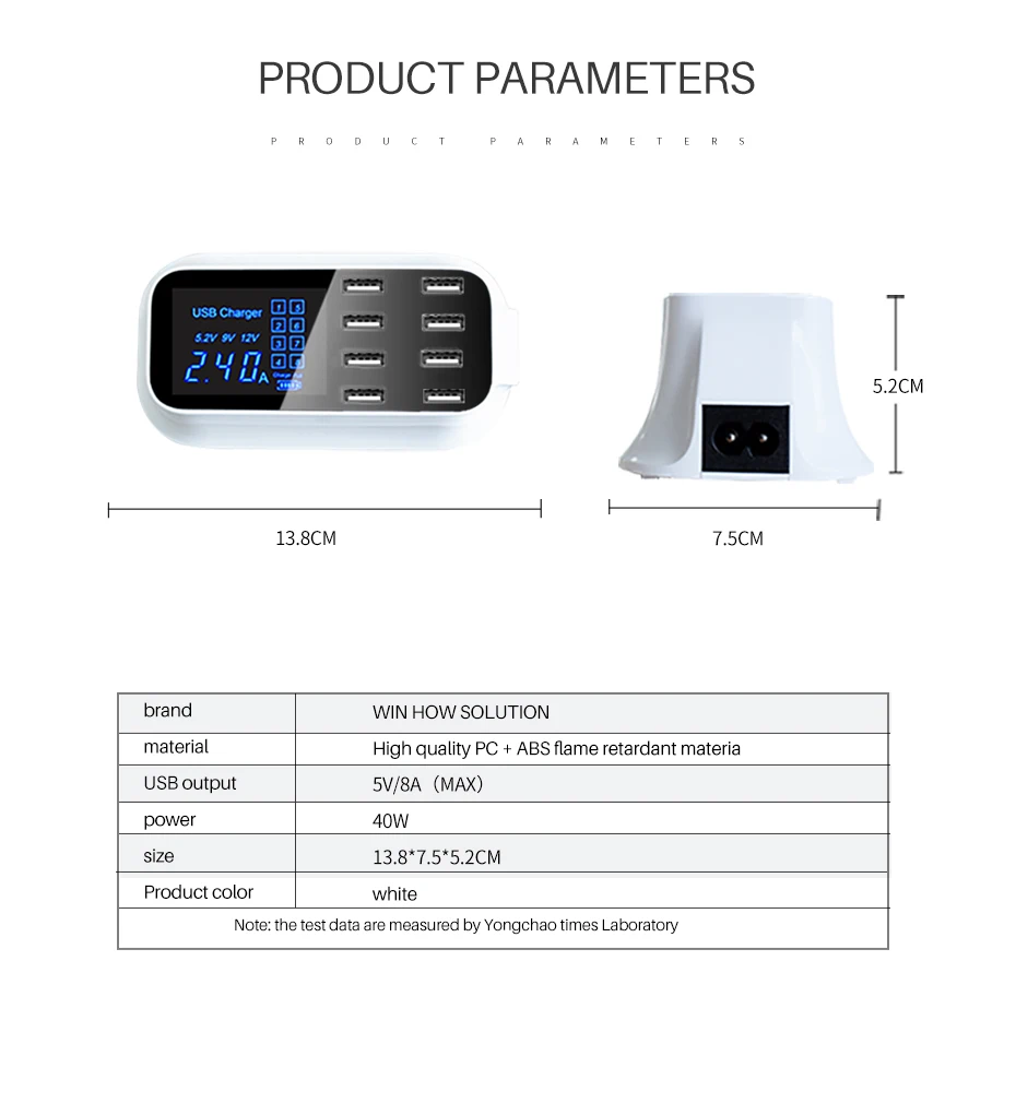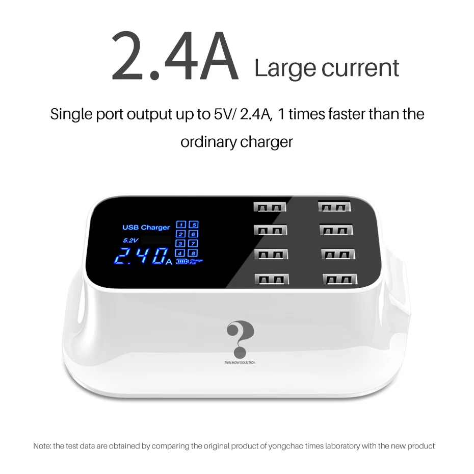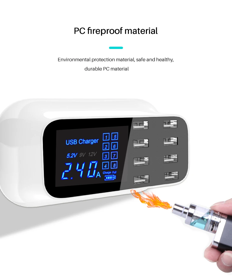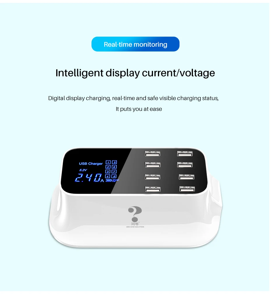 3. monitor de pantalla en tiempo Real: La pantalla LED le muestra el estado en tiempo real de los dispositivos de carga, la corriente de salida de cada puerto de trabajo, el voltaje. El número de puerto correspondiente en la pantalla se iluminará cuando esté funcionando. Los 8 puertos USB se indican de 1 a 8 en la pantalla, por ejemplo, cuando cargues tu móvil o ipad con el puerto 8, se encenderá el número 8 en la pantalla.