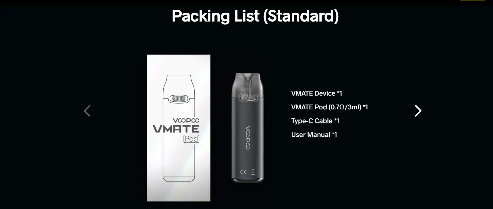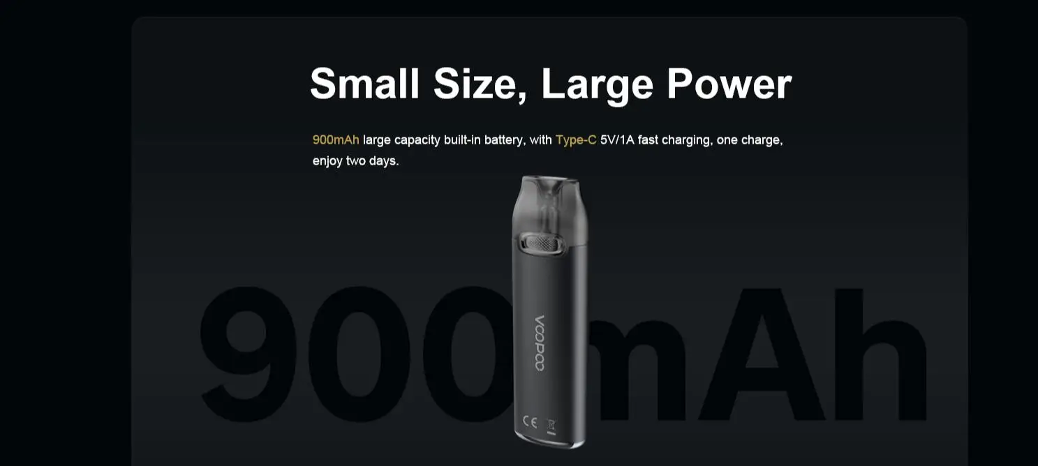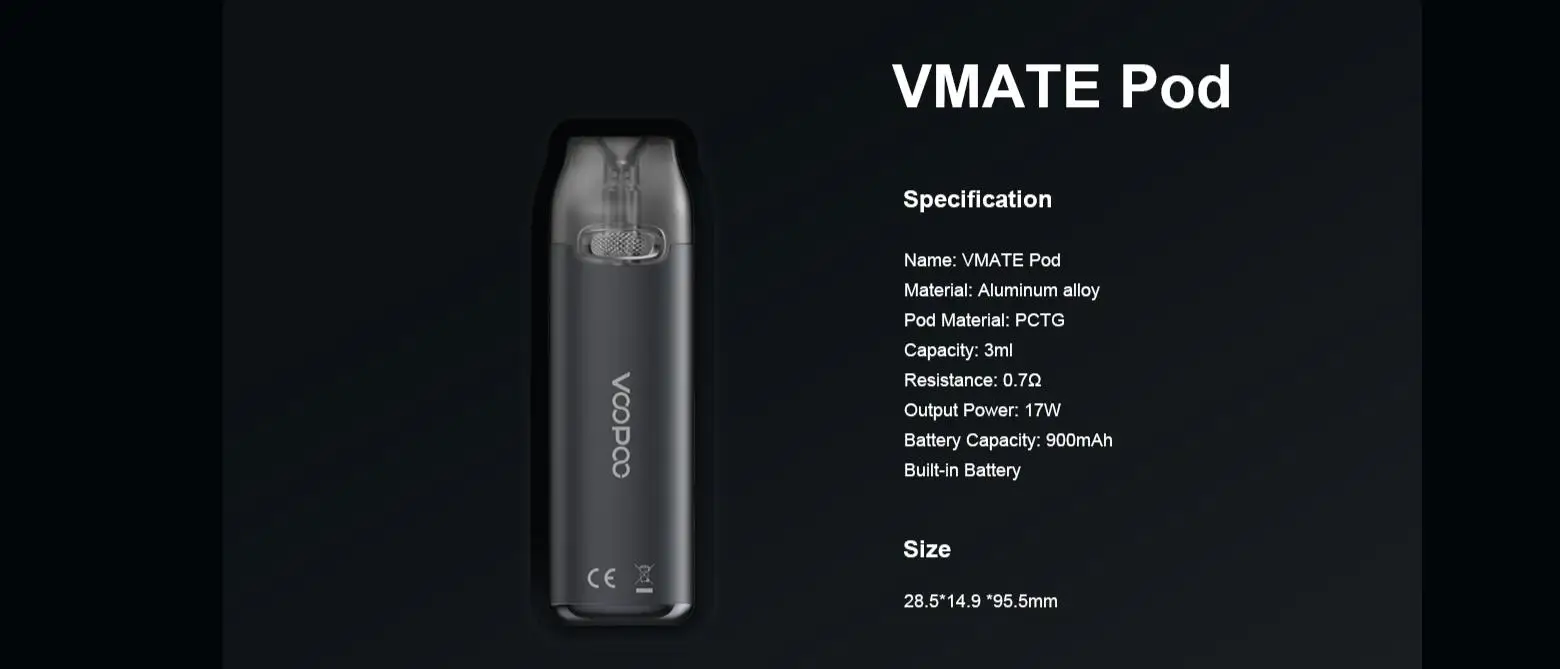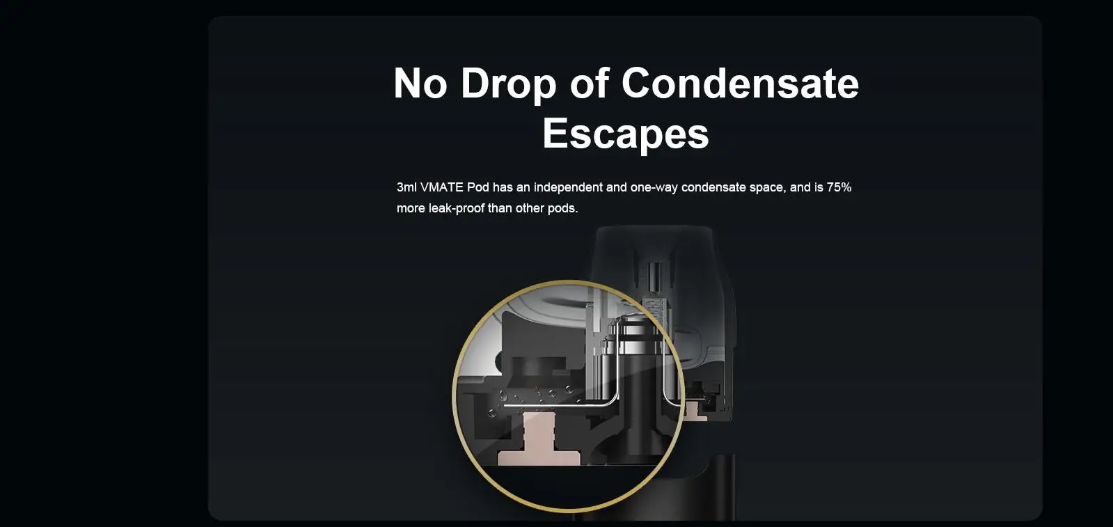 El Kit VOOPOO VMATE Pod presenta su cápsula que adopta un diseño de 360 ° totalmente apto para labios para disfrutar del vapeo y el espacio de condensación independiente y unidireccional para reducir la condensación. La cápsula tiene una bobina integrada de 0,7 ohm para un sabor puro. Con una batería integrada de 900mAh, puede emitir una potencia de 12W/17W (coincidencia automática identificando la resistencia). Además, la conexión de la cápsula y el mod utiliza succión magnética y doble refuerzo de hebilla.