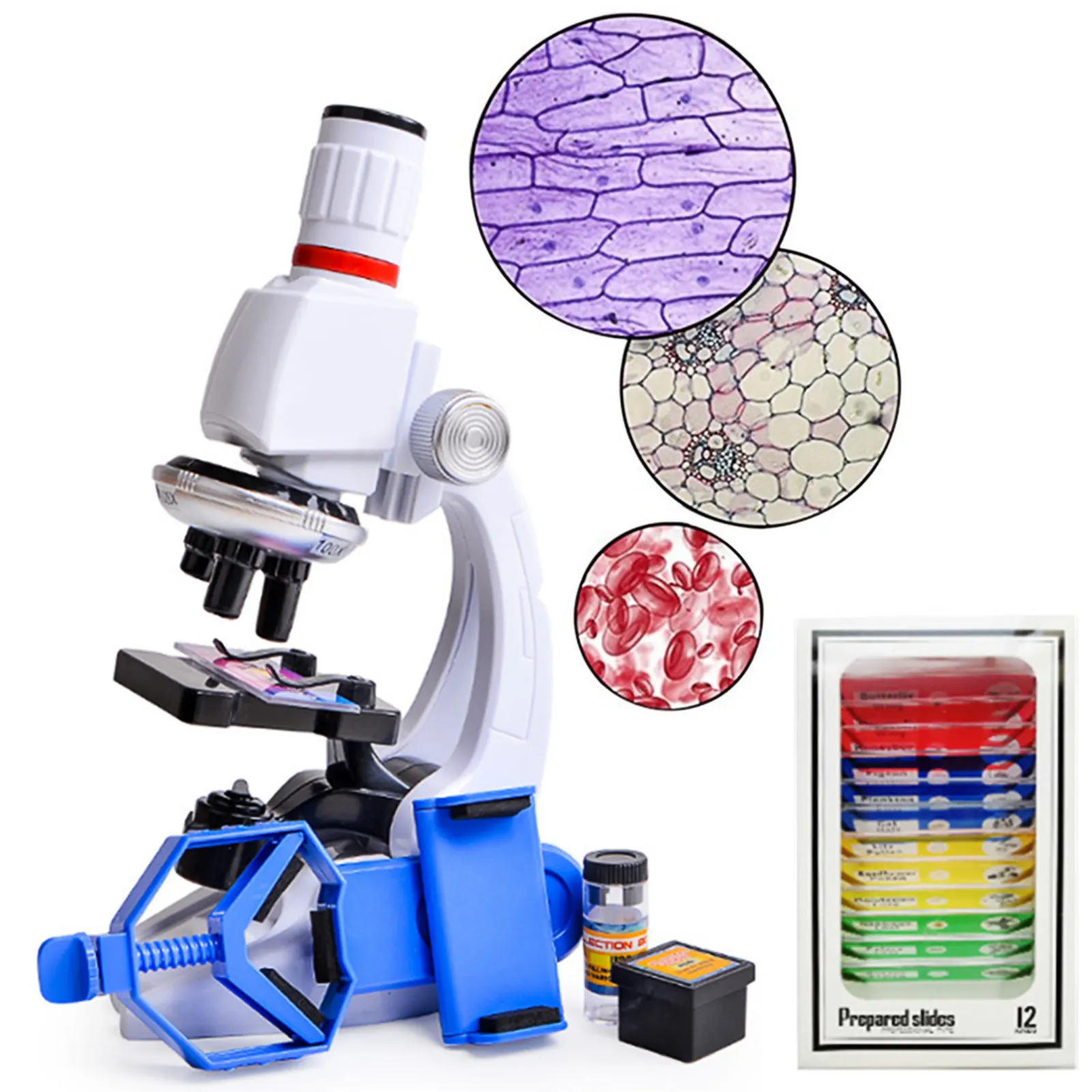 Lo que obtendrá: Incluye 1 microscopio, 1 soporte para teléfono, 12 muestras de diapositivas, 4 diapositivas de microscopio, 1 pinza, 1 fibra de muestra, 2 botellas de colección y 1 caja de muestras.