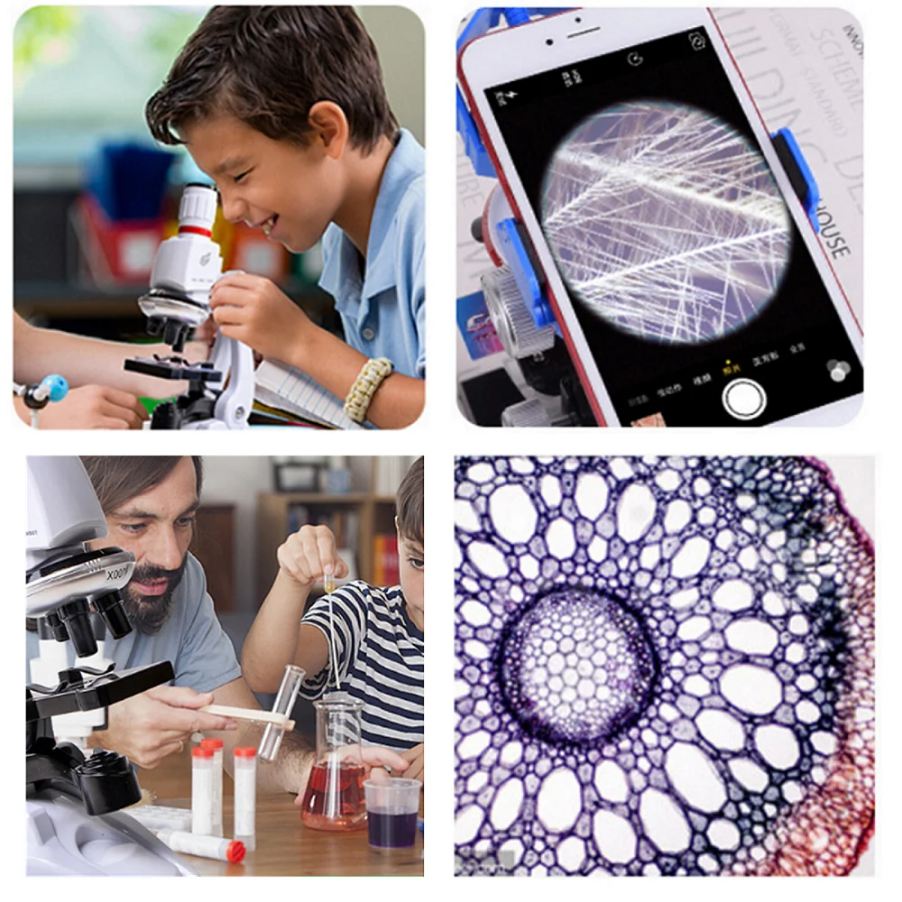 Luz LED y soporte para teléfono: las potentes luces LED le permiten usar el microscopio con una iluminación inadecuada. Y el soporte para teléfono móvil es para que los estudiantes graben las imágenes que observar.