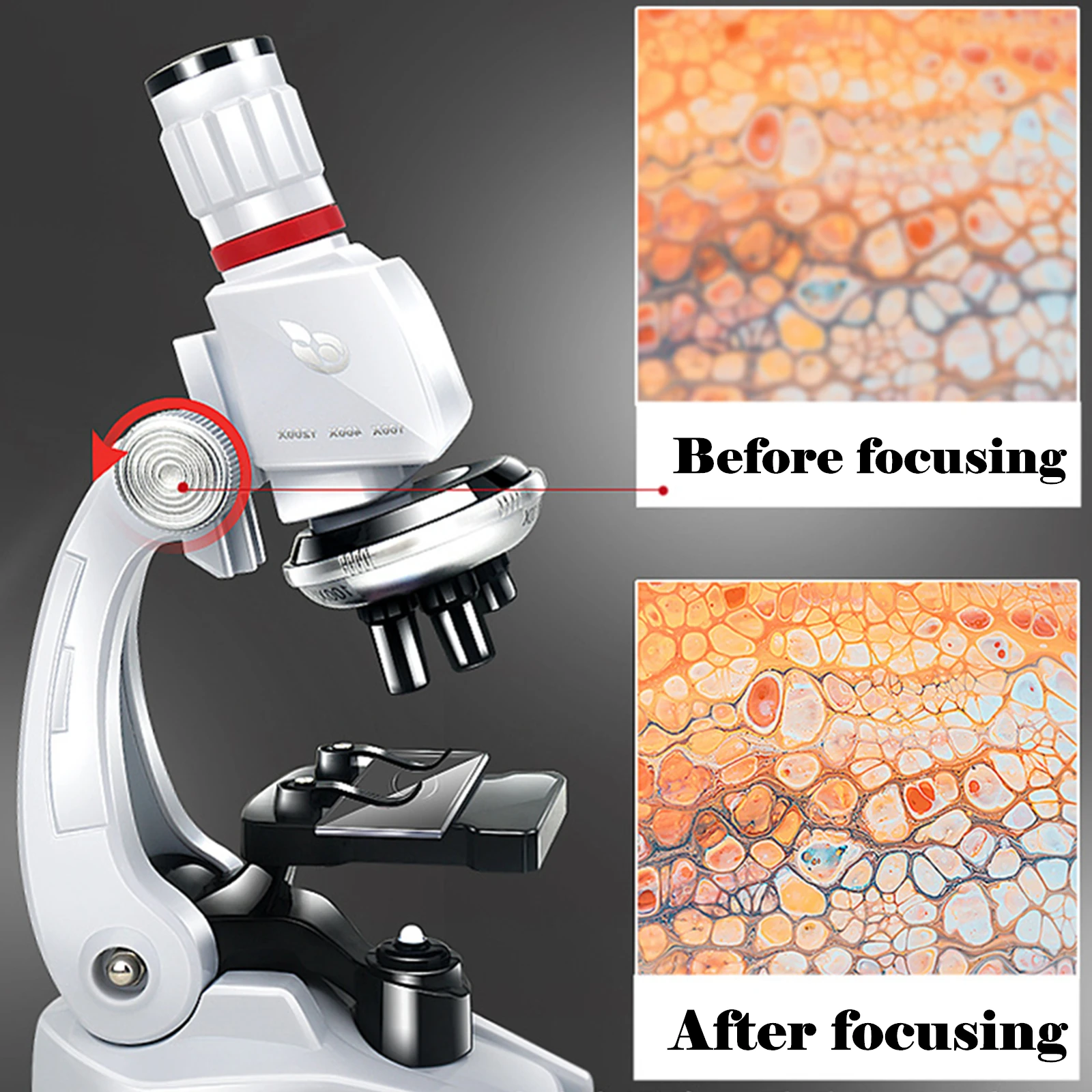 Gran Aumento: diseñado con 3 niveles de aumentos, incluyendo 1200X, 400X y 100X, conveniente para que los niños elijan al observar diferentes artículos. Brindará un claro aumento para que los niños aprendan mejor sobre el mundo biológico.