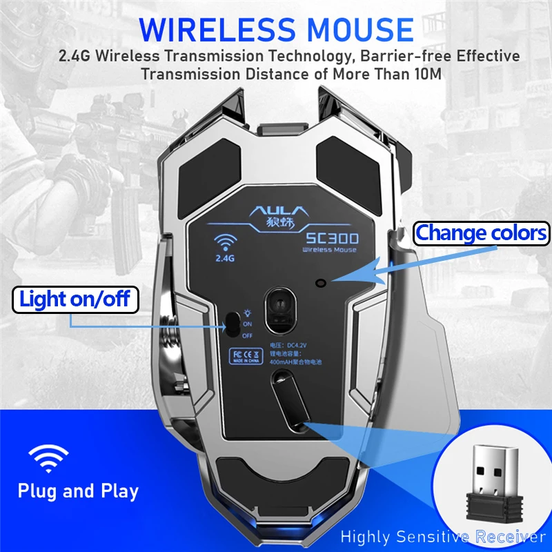 AULA-ratón inalámbrico SC300 2,4G, recargable, 4 colores, RGB, para juegos, autodetección, sueño inteligente, óptica ergonómica, para ventanas MacOS