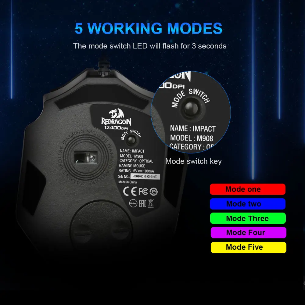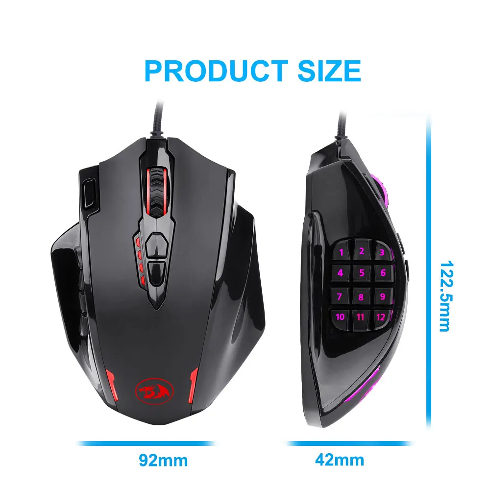 Ratón profesional para juegos-El ratón óptico Redragon M908 para juegos está diseñado con hasta 12400 DPI, 5 niveles de DPI ajustables (500/1000/2000/3000/6200 DPI) para satisfacer sus múltiples necesidades, para el trabajo diario o para juegos. El DPI se puede ajustar libremente en ± 100 de 100 a 12400 a través del software. Tasa de sondeo de 1000Hz, aceleración de 30G y Sensor Pixart PAW3327 de alta precisión que le brinda una mayor ventaja sobre su competencia.