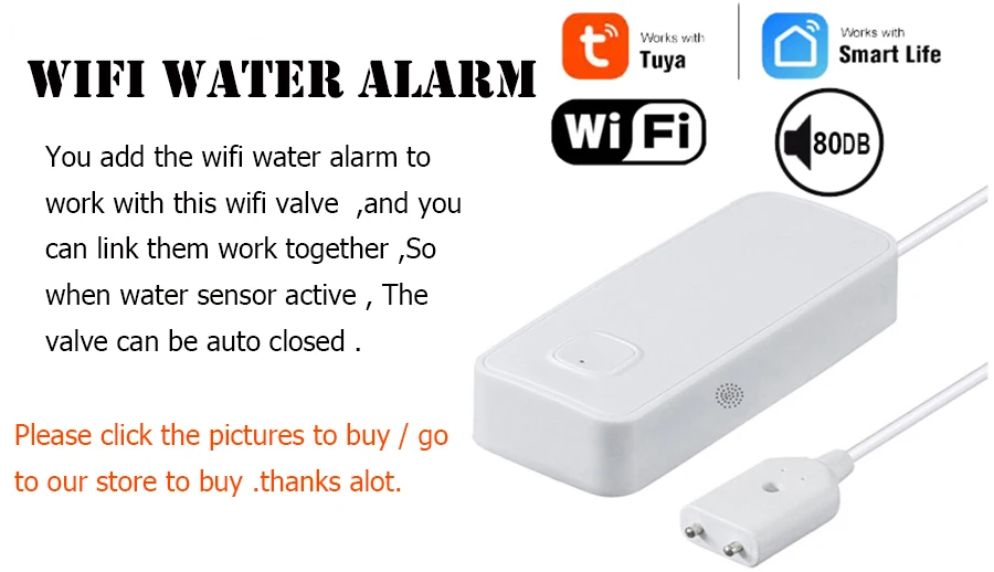 Añade la válvula wifi para trabajar con este sensor de agua wifi, y puede conectarlos a trabajar juntos, así que cuando el sensor de agua está activo, la válvula se puede cerrar automáticamente.