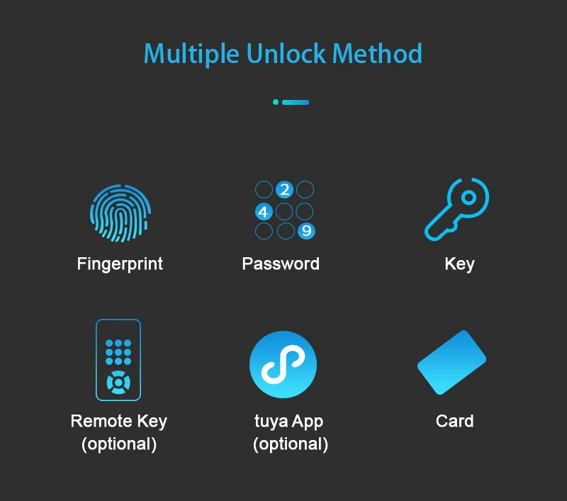 Huella digital, contraseña, tarjeta IC, llaves, control remoto por la aplicación Tuya (opcional) |