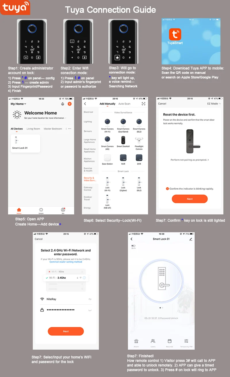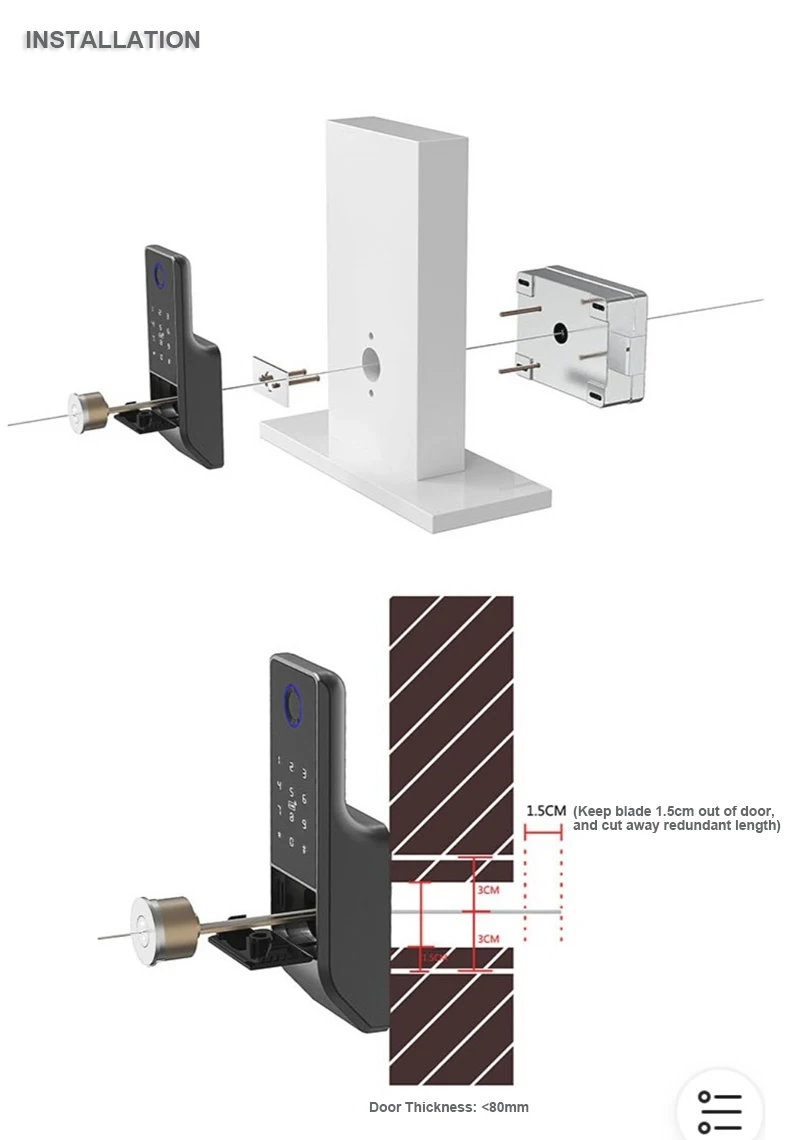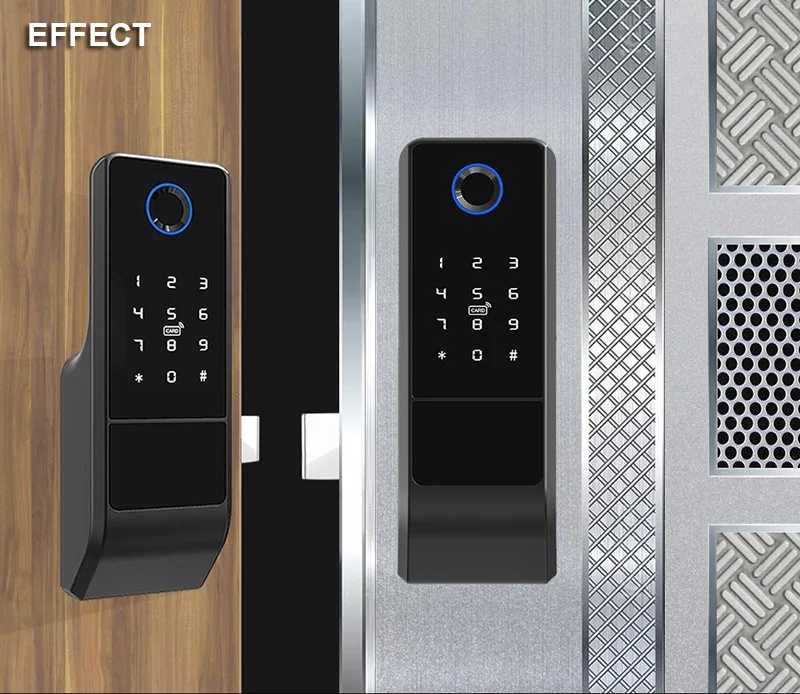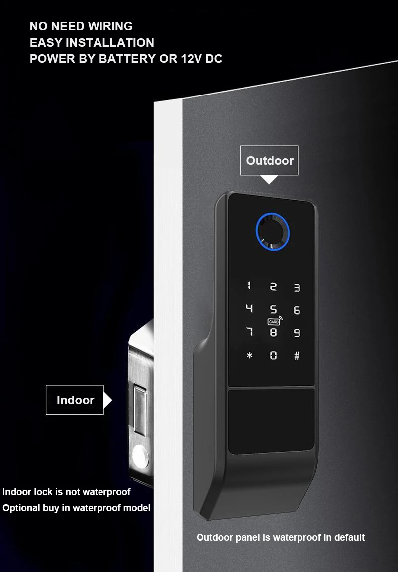 1)Resistente al agua (sin aplicación): Panel de huellas dactilares — impermeable,Cerradura interior — impermeable,Aplicación NoTuyaNo se puede controlar con un teléfono inteligente.