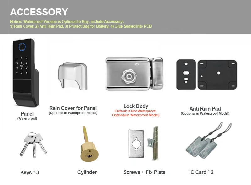 2)Básico (sin aplicación): Panel de huellas dactilares — impermeable,Cerradura interior — no impermeable,Aplicación NoTuya, No puede ser controlado por smartphone.