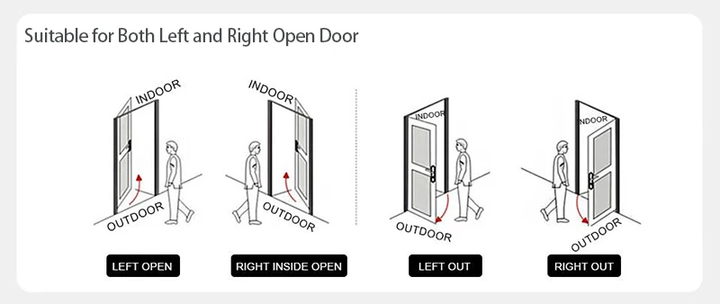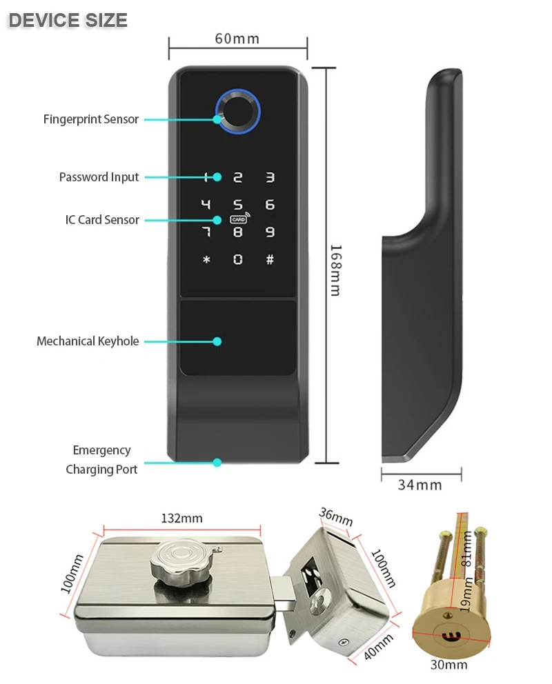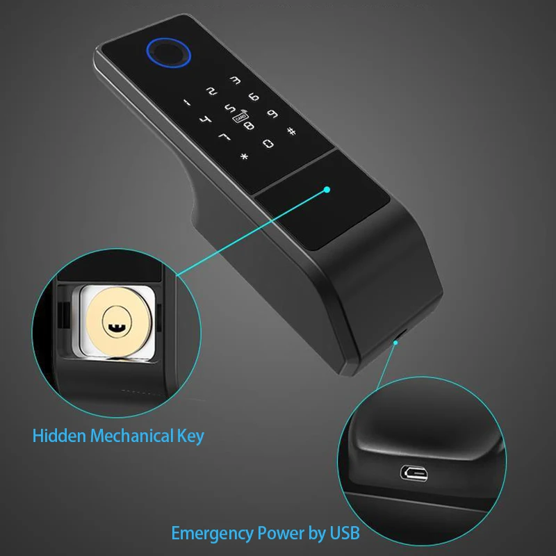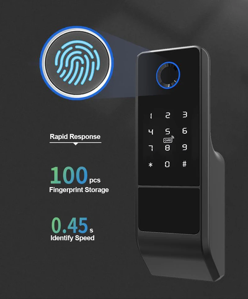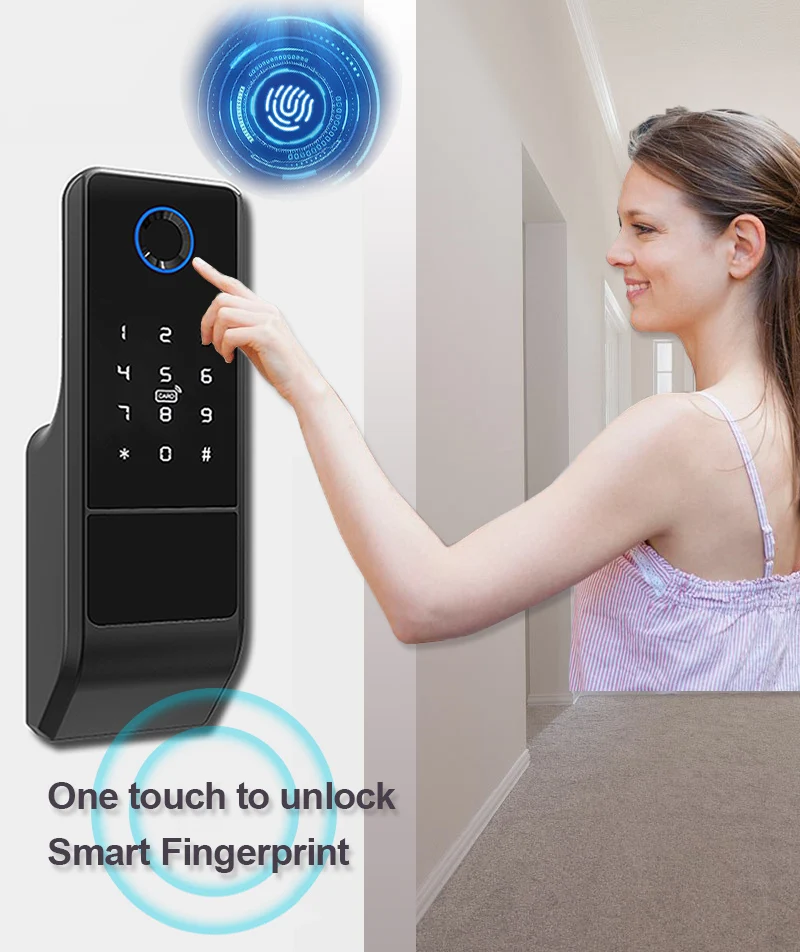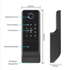 3)Resistente al agua (aplicación Tuya): Panel de huellas dactilares — impermeable,Cerradura interior — impermeable, Soporta la aplicación Tuya capaz de controlar por teléfono inteligente.