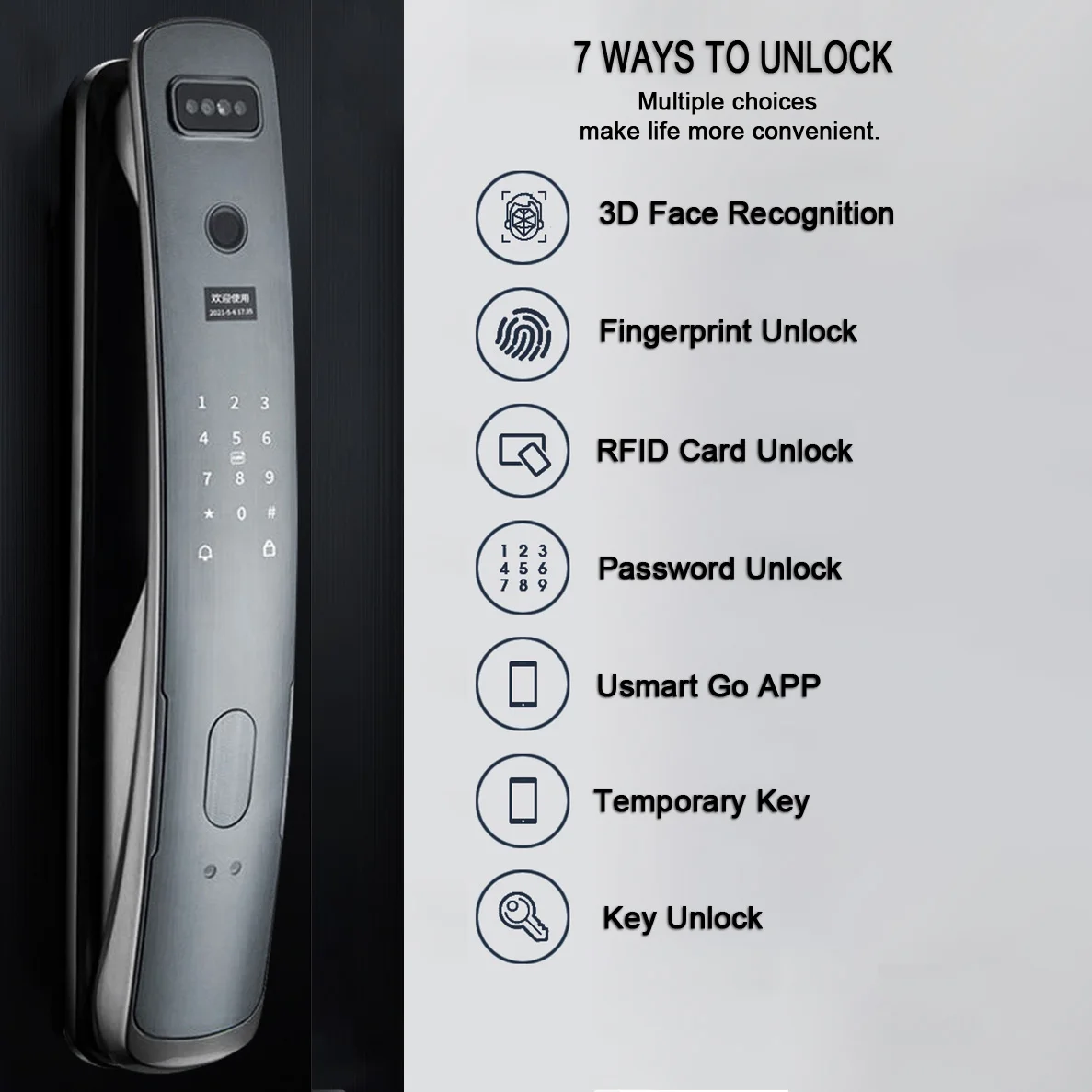 1. 6 formas de desbloqueo: cara con infraestructura 3D, Huella Digital, contraseña, tarjeta IC, llave mecánica, aplicación