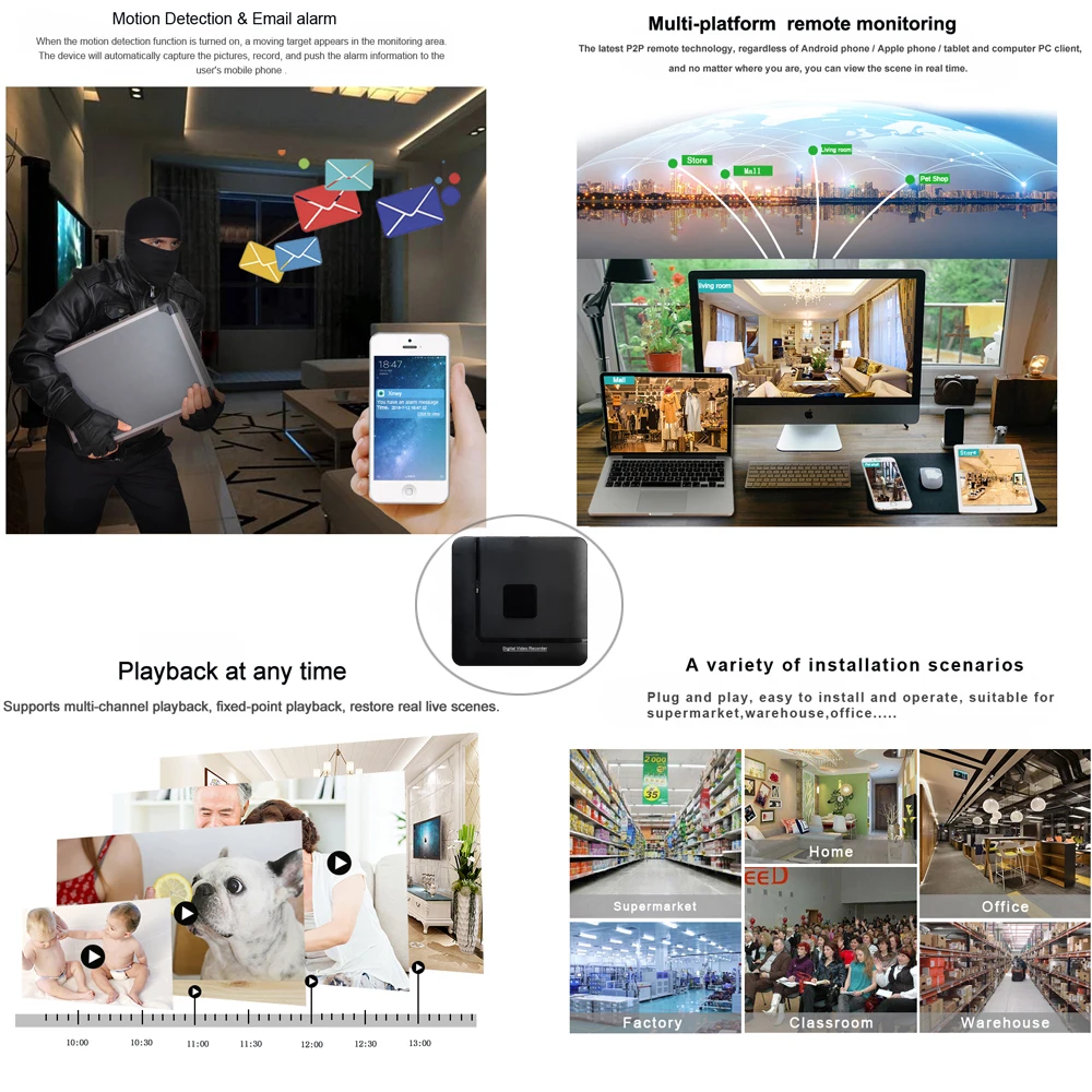 Grabación simultánea en tiempo real multicanal, reproducción, operación de red, copia de seguridad USB |